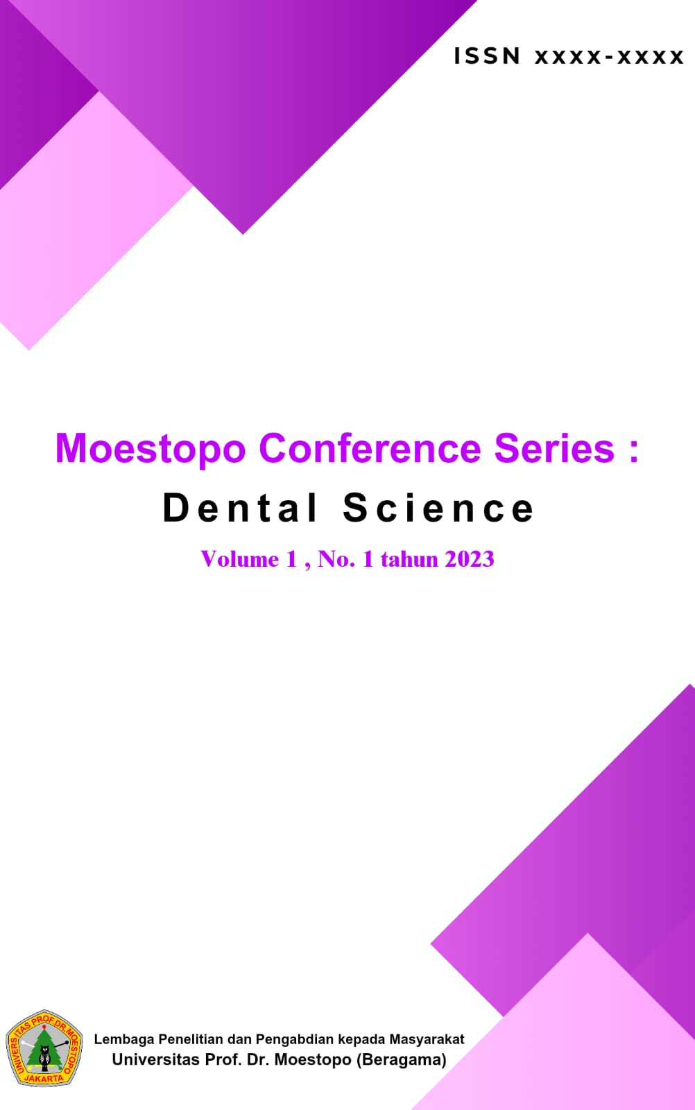Moestopo Conference Series: Dental Science merupakan media publikasi hasil-hasil penelitian dan pengabdian masyarakat dalam bidang ilmu Kedokteran Gigi yang telah dipresentasikan pada Seminar Nasional Moestopo Conference Series yang diselenggarakan oleh Lembaga Penelitian dan Pengabdian Kepada Masyarakat Universitas Prof. Dr. Moestopo (Beragama). MCSDS ini dipublikasikan pertama pada tahun 2023 yang di kelola dan di publikasikan oleh LPPM Universitas Prof. Dr. Moestopo (Beragama). Semua artikel diperiksa plagiasinya dengan perangkat lunak turnitin. Jurnal ini terindeks di Google Scholar, terbit setiap Maret dan September.