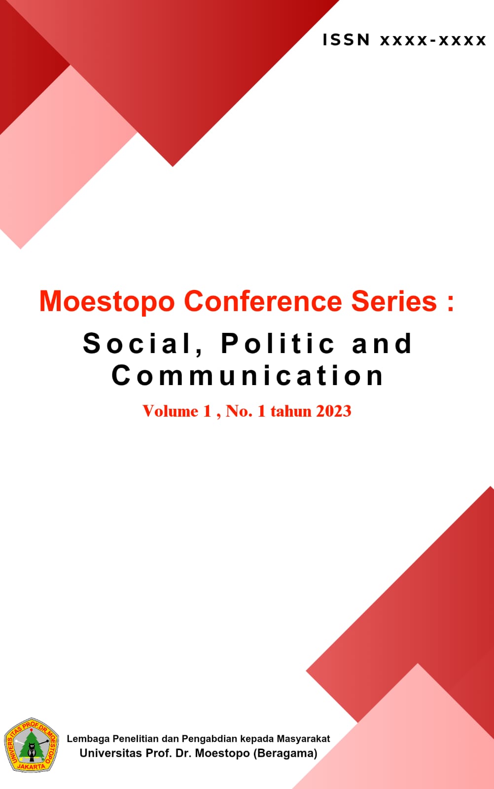 Moestopo Conference Series: Social, Politic and Communication merupakan media publikasi hasil-hasil penelitian dan pengabdian masyarakat dalam bidang ilmu Sosial, Politik dan Komunikasi yang telah dipresentasikan pada Seminar Nasional Moestopo Conference Series yang diselenggarakan oleh Lembaga Penelitian dan Pengabdian Kepada Masyarakat Universitas Prof. Dr. Moestopo (Beragama). MCSSPC ini dipublikasikan pertama pada tahun 2023 yang di kelola dan di publikasikan oleh LPPM Universitas Prof. Dr. Moestopo (Beragama). Semua artikel diperiksa plagiasinya dengan perangkat lunak turnitin. Jurnal ini terindeks di Google Scholar, terbit setiap Maret dan September.